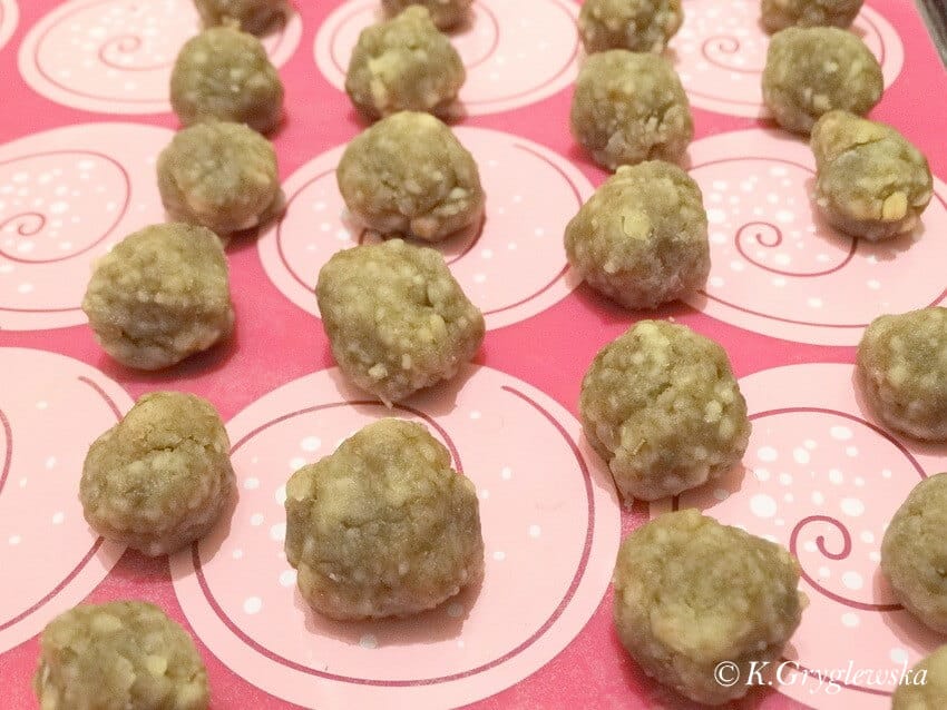 Mąkę, ser i olej wymieszać stopniowo dodając wodę. Ciasto rozwałkować do grubości ok. 1 cm i używając foremki wyciąć różna kształty lub tak jak ja zrobić kulki – nazwałam ciasteczka o tym kształcie „Psim Rafaello „ . Dla mniejszych psiaków zalecam zrobić malutkie ciasteczka ponieważ nie da się ich po upieczeniu podzielić a jak wspomniałam są bardzo kaloryczne .