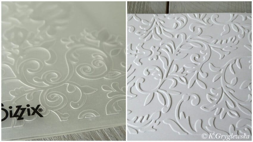 Do wytłaczania / embossingu używamy folderów. Folder ma dwa skrzydła między które wkłada się papier, następnie folder umieszcza się między dwoma przezroczystymi płytkami na platformie i taką „kanapkę” przepuszczamy przez maszynkę. Można od zeszłego roku spotkać na rynku płytki do embossingu 3 D.
